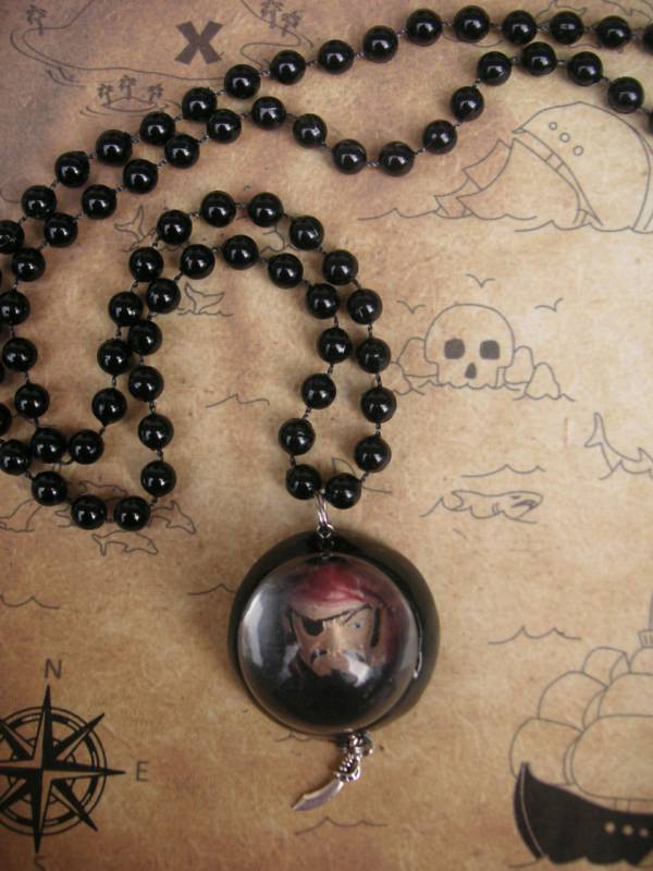 A 1-1/2" diameter hand-crafted pendant made of polymer clay, and a clear acrylic cabochon that magnifies the pirate head below.The pirate head is a Peruvian ceramic bead and the charm is pewter. The necklace is a 33" party throw style. The profile on this is fabulous! It has a 3D quality about it and almost feels like he is watching from any angle.