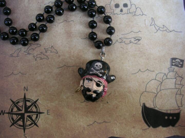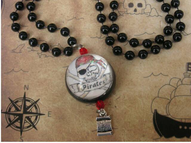 The hand-crafted pendant is approximately 1-1/2" diameter. It is made of polymer clay, and a clear acrylic cabochon with a fabulous profile that magnifies what is under it. The red beads are Czech glass, and the charms are pewter. The pirate bandana and banner are highlighted with translucent glitter. The necklace is a 33" party throw style. You may choose either a Treasure Map, Treasure Chest, Saber (sword), Pirate Ship, Skull and Crossbones, or Parrot with Pirate Hat charm. Wear them every year during Gasparilla or for your favorite team's game or a pirate party!