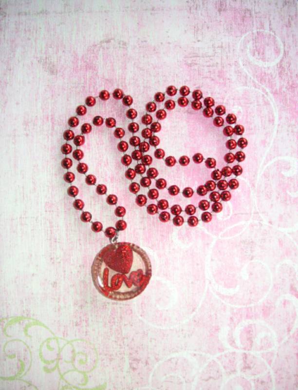 A beautiful, shimmery necklace with the word LOVE in red glitter and a red glitter heart imbedded in a clear resin pendant shaped like a Reese's cup. The necklace is a 33" party throw style with 6mm beads (shown). If you would prefer to dress it up a bit, request the lovely 33" 2.4mm red metallic ball chain necklace instead for an additional $1.50. A great way to celebrate the day or give to someone special that might not know it yet. A must see up close...the picture really doesn't do it justice!